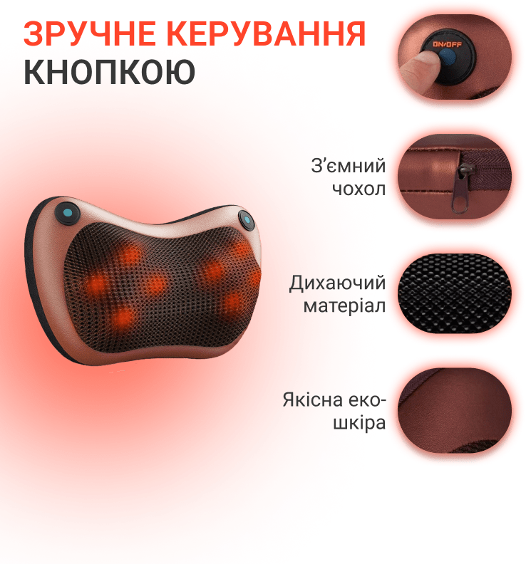Масажна подушка оснащена 8 роликами та інфрачервоним підігрівом, за рахунок злагодженої роботи яких вона виконує свої функції. Кнопка-перемикач дозволяє керувати роликовим механізмом та ІЧ підігрівом подушки, регулюючи їхню роботу за Вашими уподобаннями.